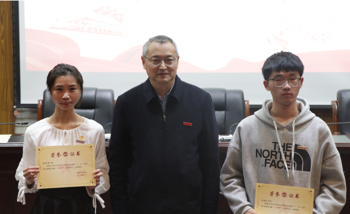 在“一马当先”知识竞赛颁奖仪式上,队长裴琼倩对“一马当先”知识竞赛做了总结,详细讲述了“一马当先”知识竞赛团队今年暑假集训40多天、经历四轮次测试选拔的学习奋斗历程。最终,sunbet官网代表队在第四季福建省高校大学生学习马克思主义理论“一马当先”知识竞赛本科组38所参赛高校中脱颖而出,总分全省高校排名第六,取得团体三等奖、两个个人优秀奖的佳绩。夏良玉、徐晓丹和陈旺玉等校领导分别为获奖的同学颁奖。