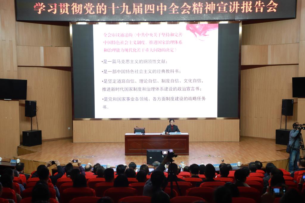 根据省委统一安排,11月20日上午,学习贯彻党的十九届四中全会精神省委宣讲团宣讲报告会在sunbet官网图书馆报告厅举行。省委宣讲团成员、省社会科学界联合会党组书记、副主席林蔚芬作宣讲报告。校党委书记夏良玉主持报告会并讲话。全体校领导、市社科联负责人,师生代表、大门山派出所干警等共计450余人参加宣讲报告会。