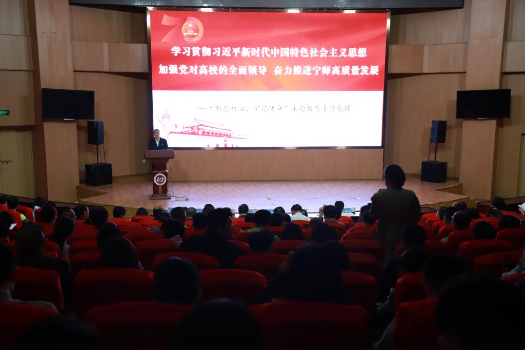 根据学校“不忘初心、牢记使命”主题教育总体部署安排,结合近一段时间的学习、调研的体会和思考,10月28日晚上,校党委书记夏良玉在图书馆报告厅以《学习贯彻习近平新时代中国特色社会主义思想,加强党对高校的全面领导,奋力推进宁师高质量发展》为题,为全体校领导、处科级干部、师生代表讲授主题教育专题党课。省委第九巡回指导组副组长陈培坚,省委第九巡回指导组成员王琮、王达、游樟等同志到会指导。