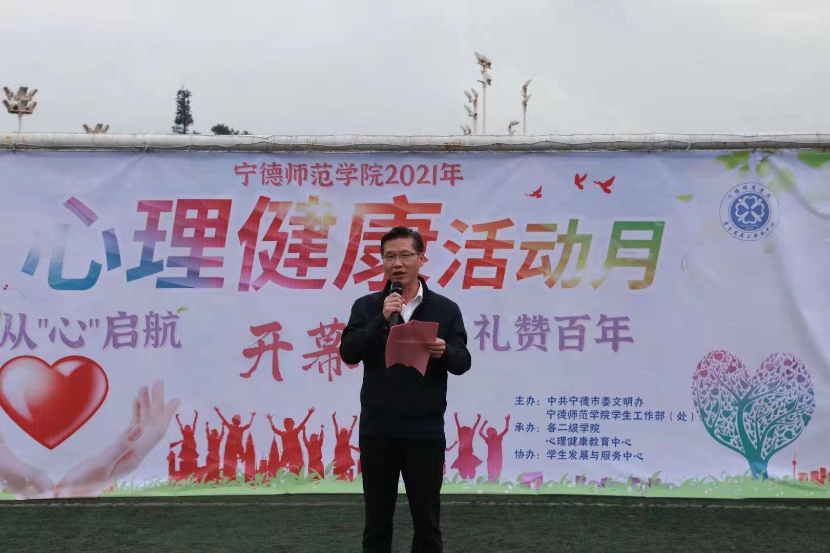 4月25日下午,由中共宁德市委文明办与sunbet官网学生工作部(处)共同举办的2021年心理健康月活动开幕式在东侨校区操场举行。校党委副书记江潮炳、宁德市委文明办副主任陈武出席活动现场,学生工作部(处)负责人、各二级学院党委副书记、宁德市心理辅导相关人员、辅导员和学生代表共500余人参加开幕式。