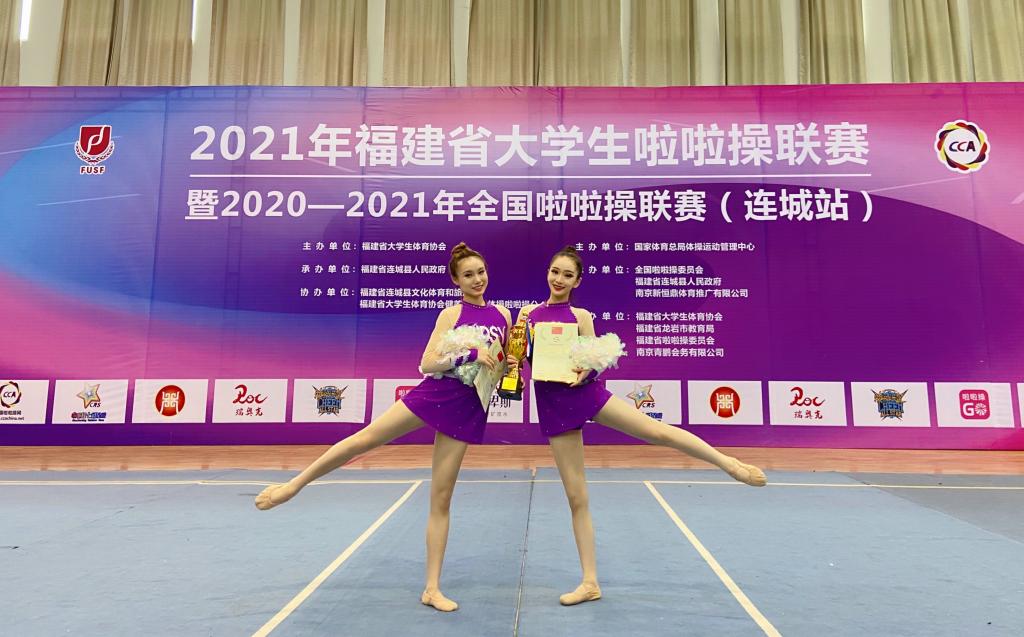 2021年福建省大学生啦啦操联赛暨2020-2021年全国啦啦操联赛(连城站)于2021年5月28日至5月31日在福建省龙岩市连城县武术综合训练馆举行,sunbet官网代表队获青年俱乐部组双人花球舞蹈自选动作第一名、青年俱乐部组集体街舞舞蹈啦啦操规定动作第一名、甲A组双人花球舞蹈啦啦操自选动作第二名、甲A组街舞舞蹈啦啦操规定动作第三名、甲A组校园示范套规定动作第四名,学校获“体育道德风尚奖”。