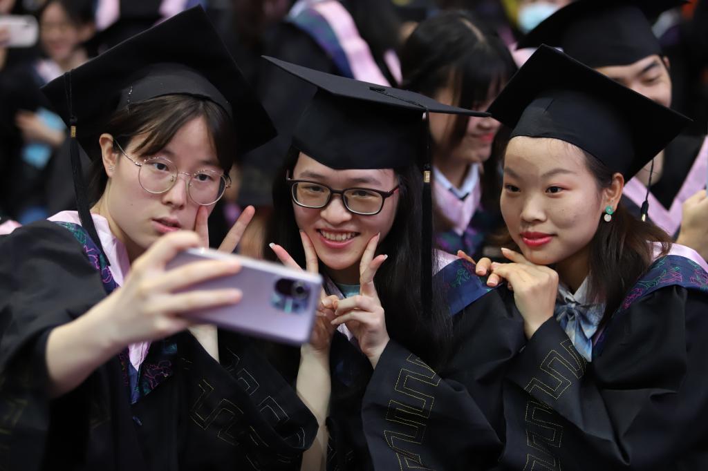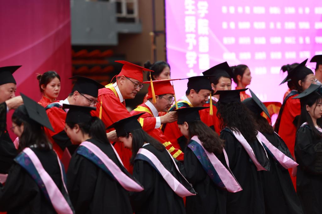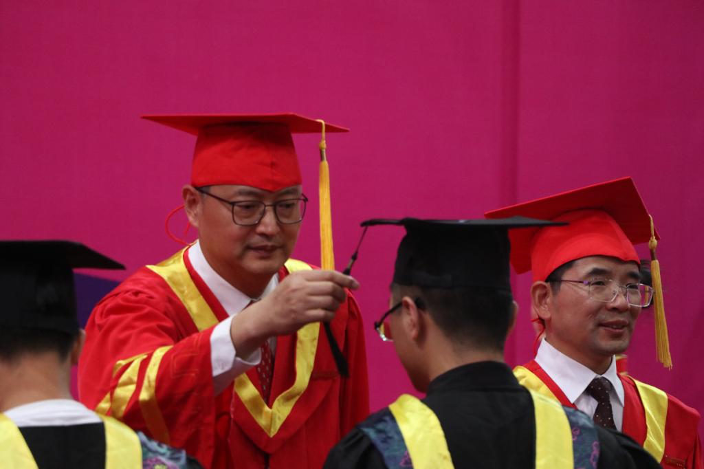 毕业典礼结束后,举行学士学位授予仪式。2021届共有2500多名学生获学士学位,463名学生获评“优秀毕业生”。全体校领导和学位评定委员会委员依次为毕业生颁发学位证书,扶正学士帽流苏,合影留念。