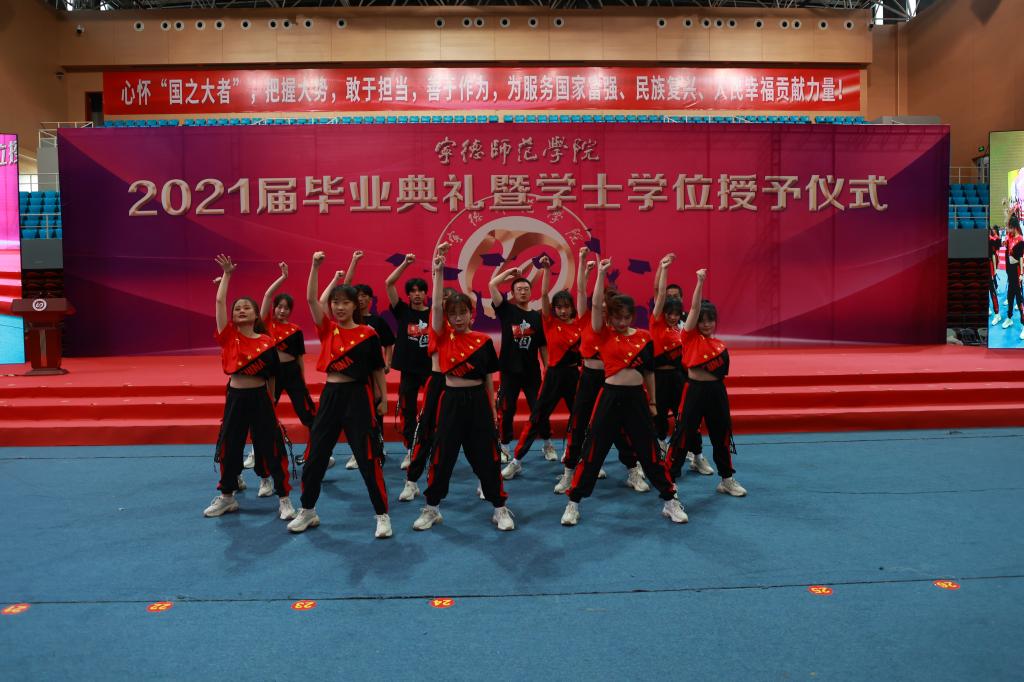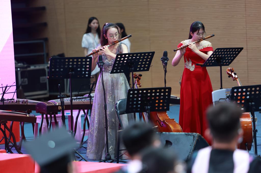 毕业典礼、学士学位授予仪式、快闪节目、校友联络员聘任等同台进行,融仪式、音乐、合唱于一体,钢琴、小提琴等全程演奏,形式多样、内容丰富。青春啦啦操和快闪活动《唱支山歌给党听》等快闪表演,现场点燃同学们爱党爱国爱社会主义的热情,为即将步入社会的毕业生上了本科教育的最后一堂思政课。