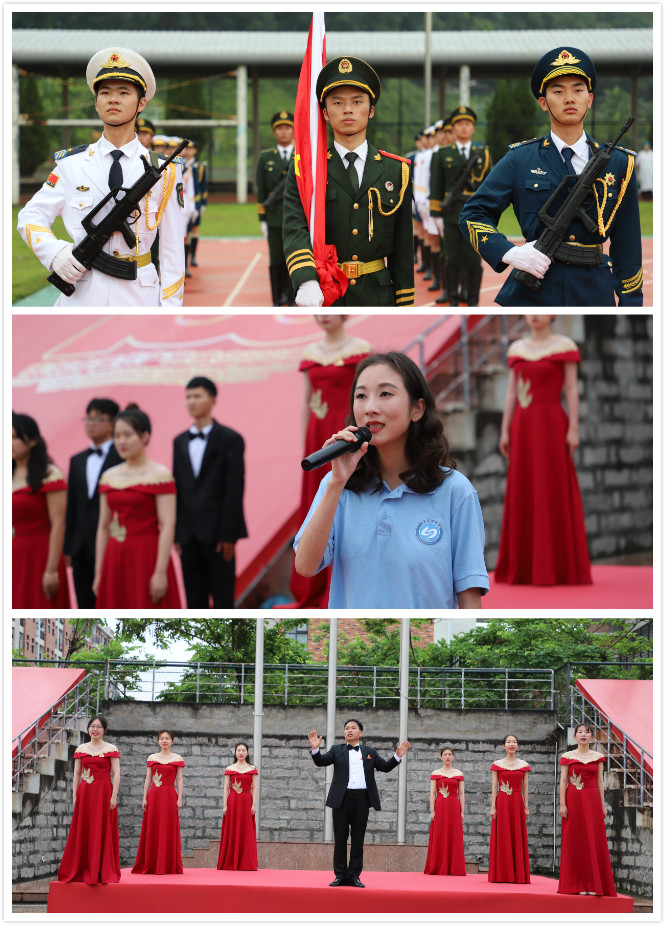 随着一声“升国旗、奏唱国歌”的口令,英姿飒爽的国旗护卫队队员昂首挺胸,迈着整齐划一、铿锵有力的步伐护卫着国旗走上升旗台。雄壮有力的国歌响起来,鲜艳的五星红旗伴随着庄严的国歌,冉冉升起,迎风飘扬。全体师生面向国旗庄严肃立,上万双眼睛随着国旗的上升缓缓移动,目光坚定,以饱满的精神状态,向党表明:强国有我,请党放心!