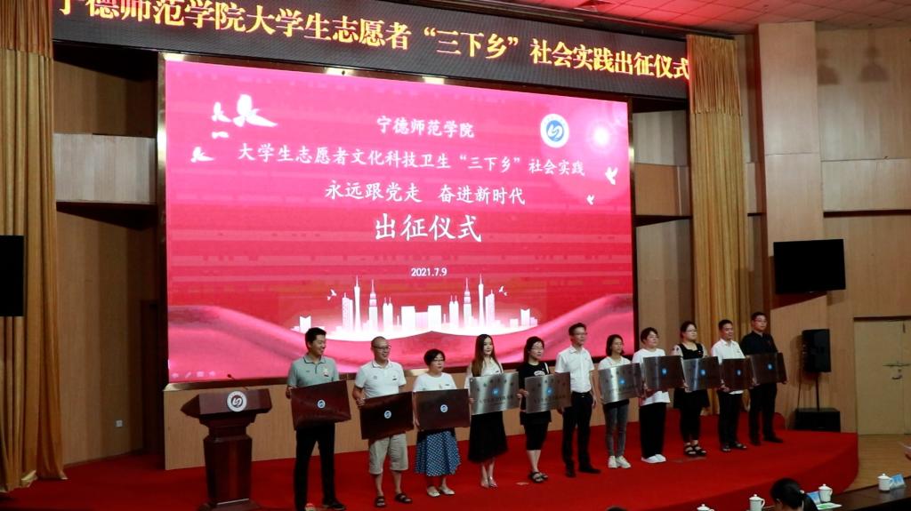 出征仪式中校党委副书记江潮炳为各学院授予社会实践基地牌,校社会实践领导小组为实践队代表授旗。