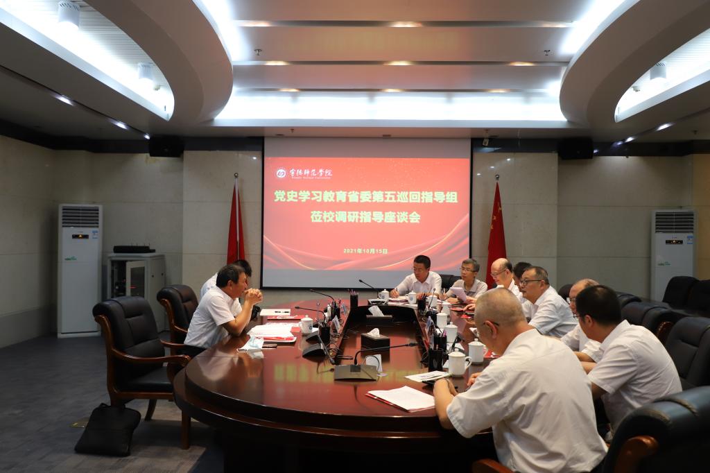 10月14日下午,省委党史学习教育第五巡回指导组副组长陈培坚一行二人莅临sunbet官网检查指导党史学习教育工作开展情况。校党委书记夏良玉、校纪委书记张胜泉及相关部门负责人参加了座谈会。会议由党委书记夏良玉主持。