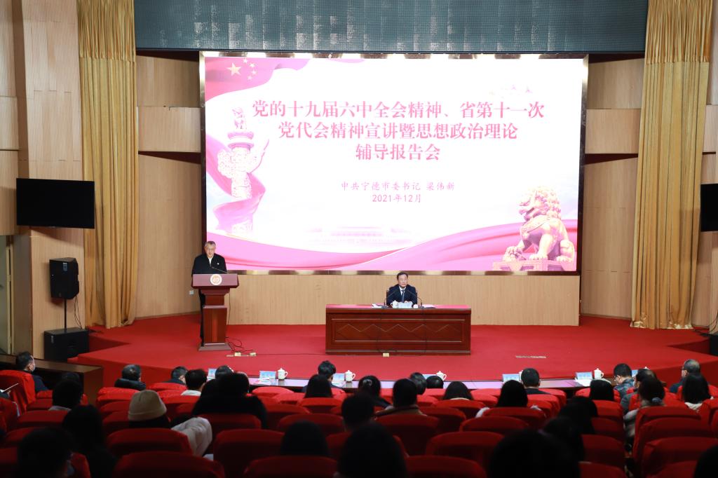 12月28日下午,中共宁德市委书记梁伟新莅校宣讲党的十九届六中全会精神和省第十一次党代会精神,并为师生代表作思想政治理论辅导报告。校党委书记夏良玉主持宣讲会。市委常委、宣传部部长李彦,市委办公室、宣传部、市教育局主要负责同志,学校领导班子成员,学校党委工作部门、各二级学院和附属医院负责人、各二级学院支部书记、双带头人、马克思主义学院教师代表、学校优秀学生代表共计220多人参加宣讲报告会。
