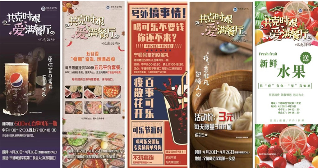 学校还组织开展“共克时艰,爱满餐厅”一系列优惠活动,以食堂菜品打折、福利发放等形式,满足了每一个宁师学子的胃,让大家真真切切感受到来自学校的温度。小笼包实行特价优惠,用“蒸”情回馈宁师学子;限时赠送饮料、水果;食堂还销售五元平价套餐,荤素搭配,菜品丰富等等。生命科学学院朱贺静同学感慨道:“有一种幸福叫学校发福利了,有一种温暖叫被学校时刻念着想着,我们都是被宁师宠爱的孩子。”