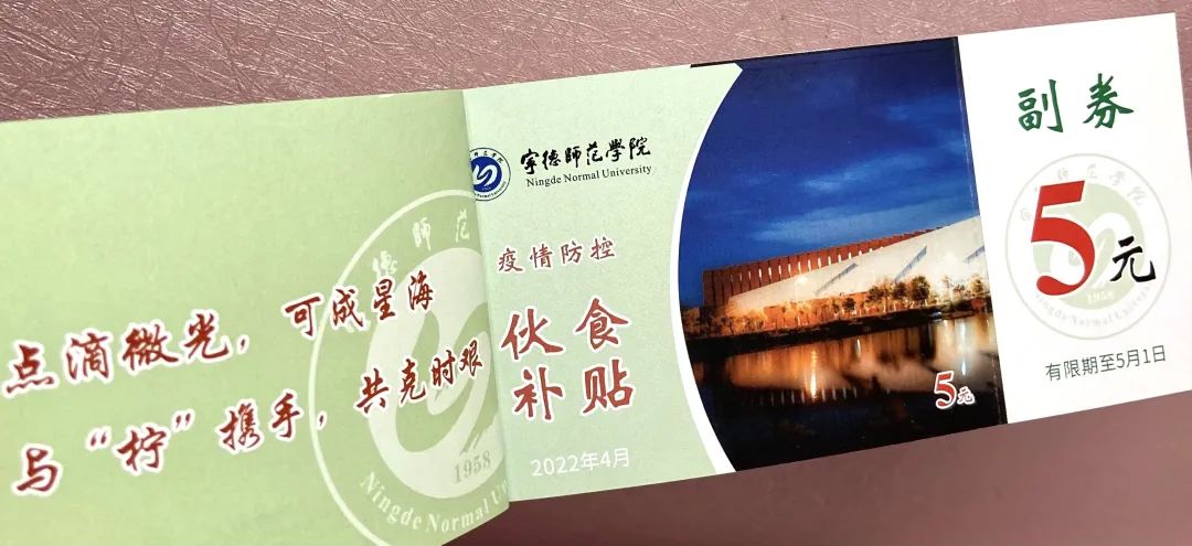 为保障学生疫情期间生活质量,4月19日,学校为8700多名在校生发放60元餐券,每人12张面值五元的使用券。每一张餐券背后是不同的暖心话语,鼓舞着每一个宁师学子,“柠”心聚力,共同抗“疫”。