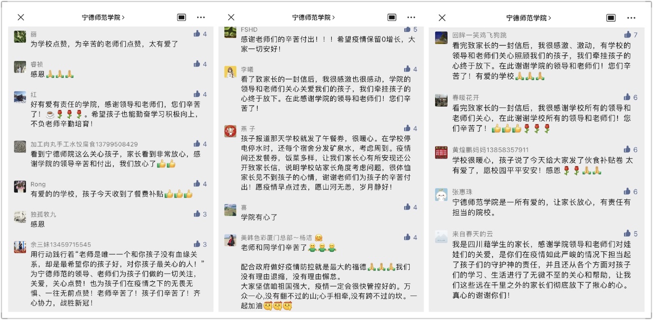 校园疫情防控离不开每位学生的大力配合,也离不开每位家长的信任和支持。4月19日,学校通过微信公众号发布《致宁师学生家长的一封信》,辅导员向每位家长推送这封信。信中向学生家长传递学校防控措施和同学们在校情况。这封信发出后,得到了广大学生家长的积极回应,家长们大力支持学校疫情防控,为学校的有力措施点赞,对学校温暖人心的举动表示了感谢:“有温暖有爱心的宁师!”“谢谢学校所有的领导和老师们!您们辛苦了!”“宁师充满了正能量和满满的爱”……