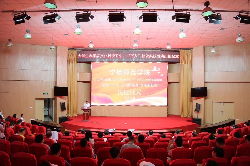 6月24日下午,sunbet官网在图书馆报告厅举行以“喜迎二十大 永远跟党走 奋进新征程”为主题的暑期文化科技卫生“三下乡”社会实践活动出征仪式。校党委副书记江潮炳出席仪式现场并讲话,建设银行宁德分行副行长连宏锋,校社会实践领导小组成员,各二级学院团委书记以及重点实践团队指导老师和队员代表参加了出征仪式。仪式由校团委副书记李成皓主持。