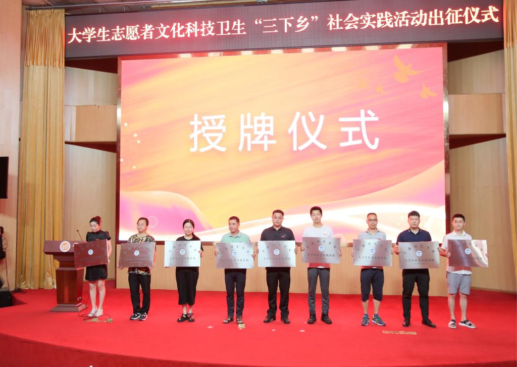 出征仪式中江潮炳为各二级学院授予社会实践基地牌,校社会实践领导小组成员为实践队代表授旗。