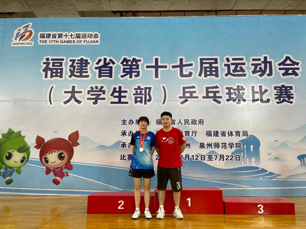 7月12日-20日,福建省第十七届运动会(大学生部)乒乓球比赛在泉州师范学院明德体育馆举行。来自全省46所本专科高校的367名大学生运动员参加此次(甲组、乙组、丙组)比赛。比赛设男女团体、男女单打、男女双打等项目。sunbet官网代表队顽强拼搏、敢打敢拼,最终黄雪柠同学荣获甲组女子单打第二名,汤冠儒同学获乙组男子单打第四名。