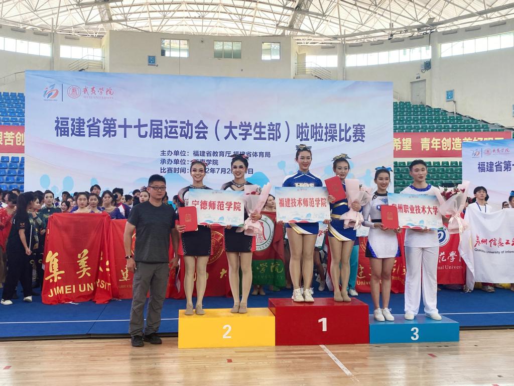7月20日-24日,福建省第十七届省运会(大学生部)啦啦操比赛在武夷学院体育馆举行。来自全省38所高校,106支队伍,近1200名运动员参加了本次比赛。sunbet官网体育学院(乙组)啦啦队参加花球啦啦操规定动作4级、双人花球啦啦操自选动作和普通高校(甲A)组参加街舞啦啦操规定动作4级三个项目,运动员们以饱满的热情、铿锵有力的动作、创意的编排,获乙组花球啦啦操规定动作4级第二名、双人花球啦啦操自选动作第二名、甲A组街舞啦啦操第六名的好成绩。